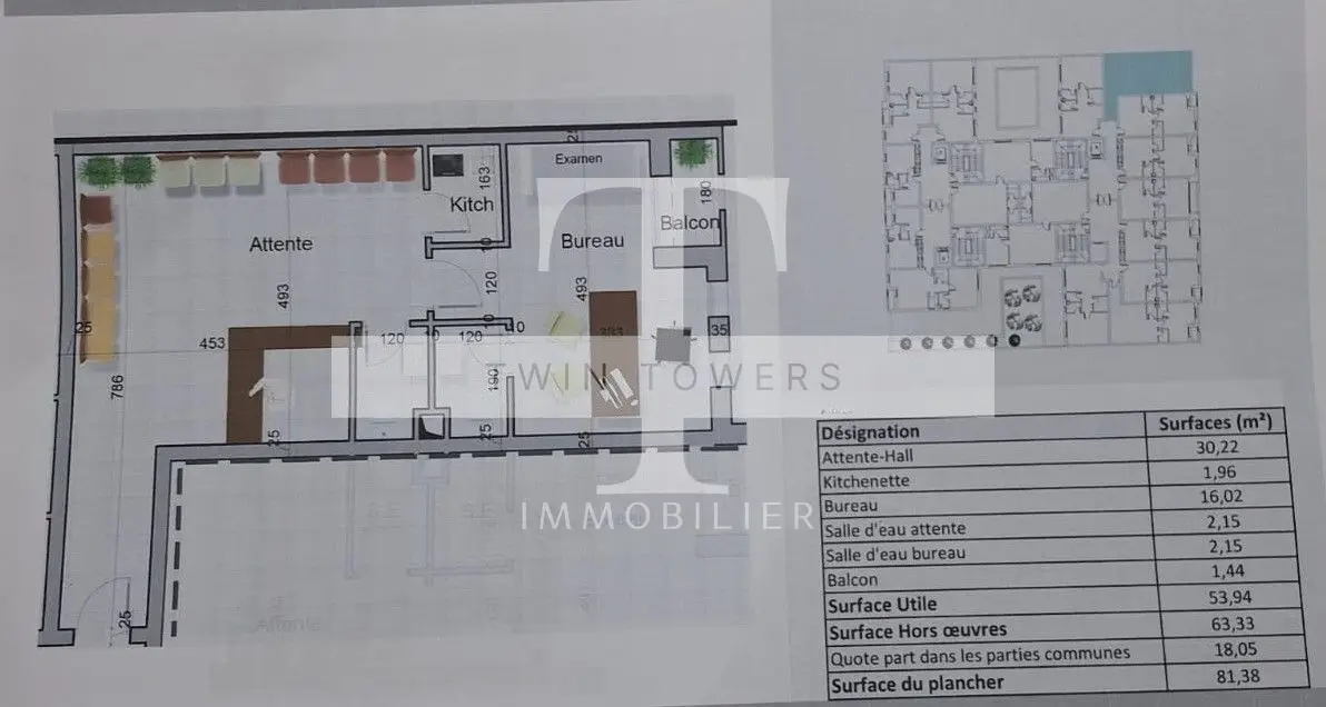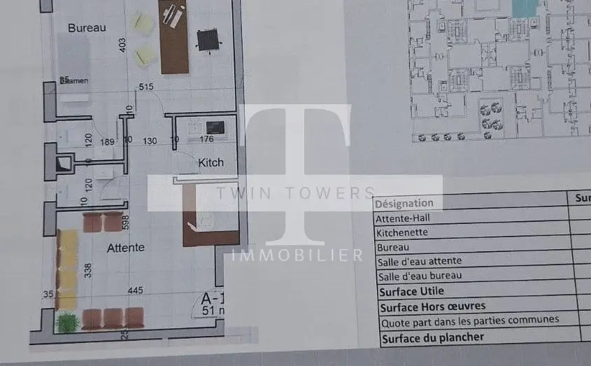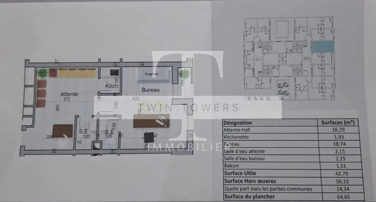 TWIN TOWERS IMMO vous propose à la vente des Bureaux A+1 de Haut Standing d'une superficie totale à partir de 64.65m² , 74.75 m² , 81.31 m² situé au 2eme étage avec Ascenseur à Sousse ville , juste à côté d'un centre médical, Clinique, pharmacie, cabinets, transports, toutes les commodités . Le bureau se compose comme suite : - Espace d'attente - 01 Bureau - 02 Points d'eau Caractéristiques : - Bonne orientation - Revêtement sol Grès gris clair de 1 er choix - Menuiserie Aluminium en Double Vitrage et Store roulant Motorisé - Portes extérieurs et intérieurs en bois massif chaîne - Isolation Thermique et acoustique dans les murs et sols - Climatisation en split double fonctions - Parking sous-sol en vidéo surveillance Prix de vente 3170 TND le M² HORS TAXE Prix de la place parking est : 20.000 TND Appelez nous pour le visiter gratuitement. Votre conseillère : Mlle ESLEM: 98 116 700 Whatsapp / Votre Conseiller : Mr Wissem : 98 116 701 Whatsapp . E-mail : contact@twintowers-immo.tn // twintowersimmo@gmail.com Notre agence Twin Towers vous souhaite la bienvenue !